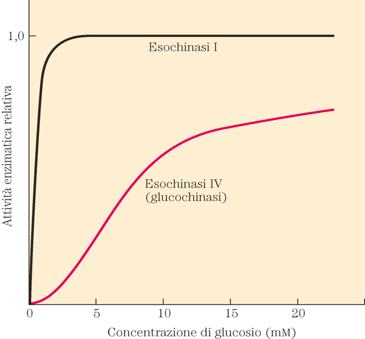 - L’esochinasi I e II hanno elevata affinità al glucosio infatti sono per metà saturate a contrazioni di glucosio pari a 0,1 mM per cui a condizioni fisiologiche agiscono alla massima velocità .